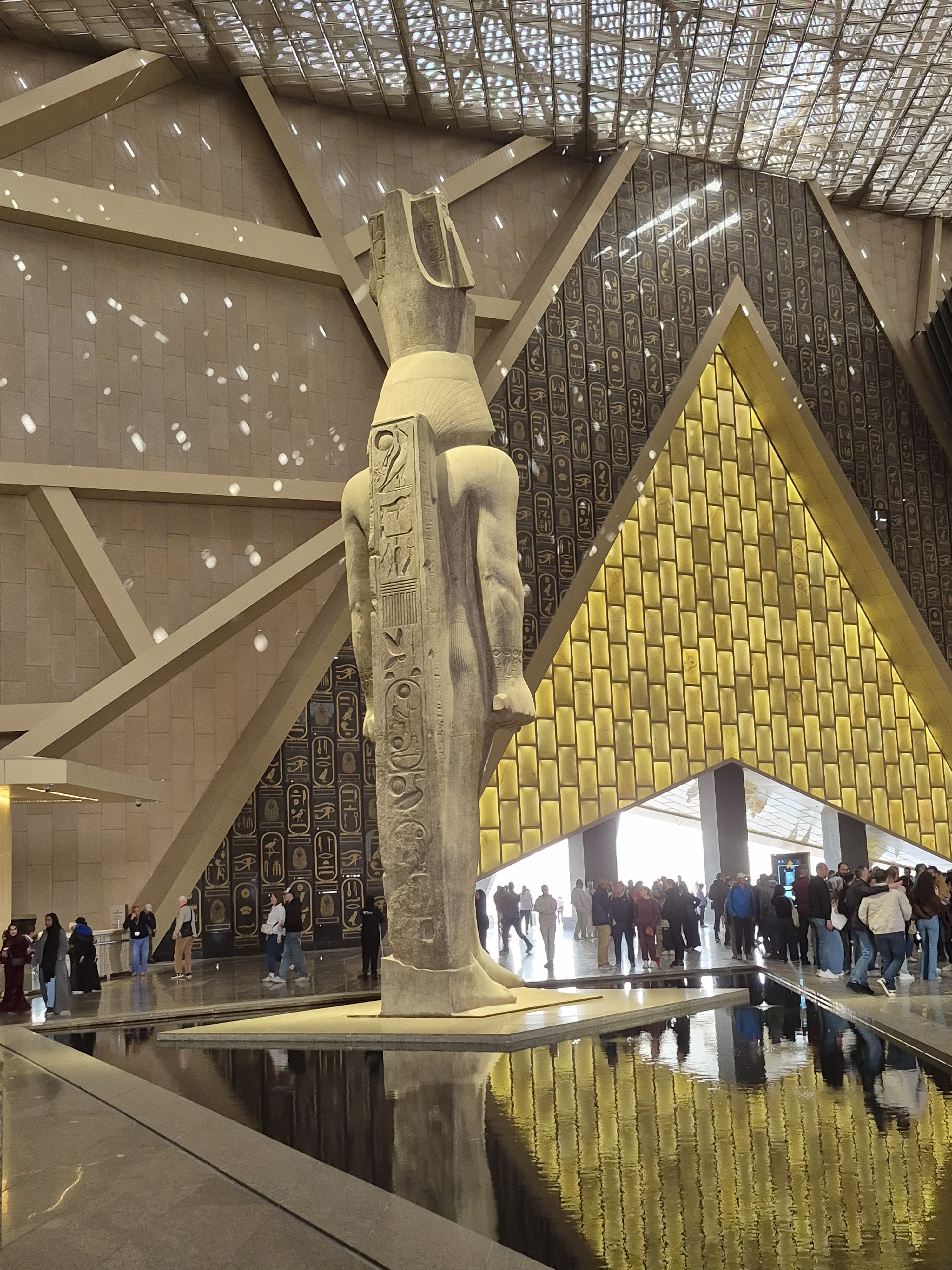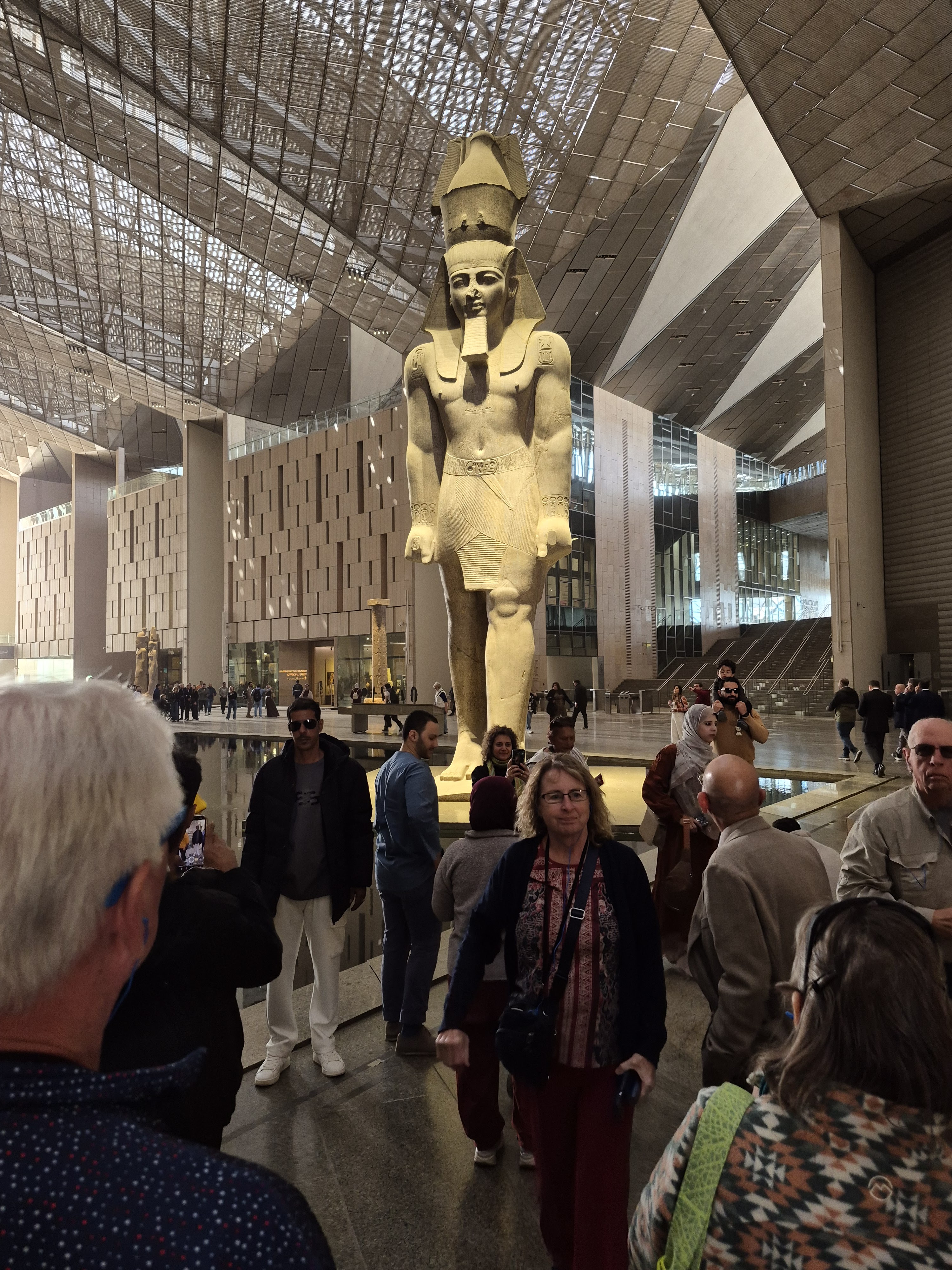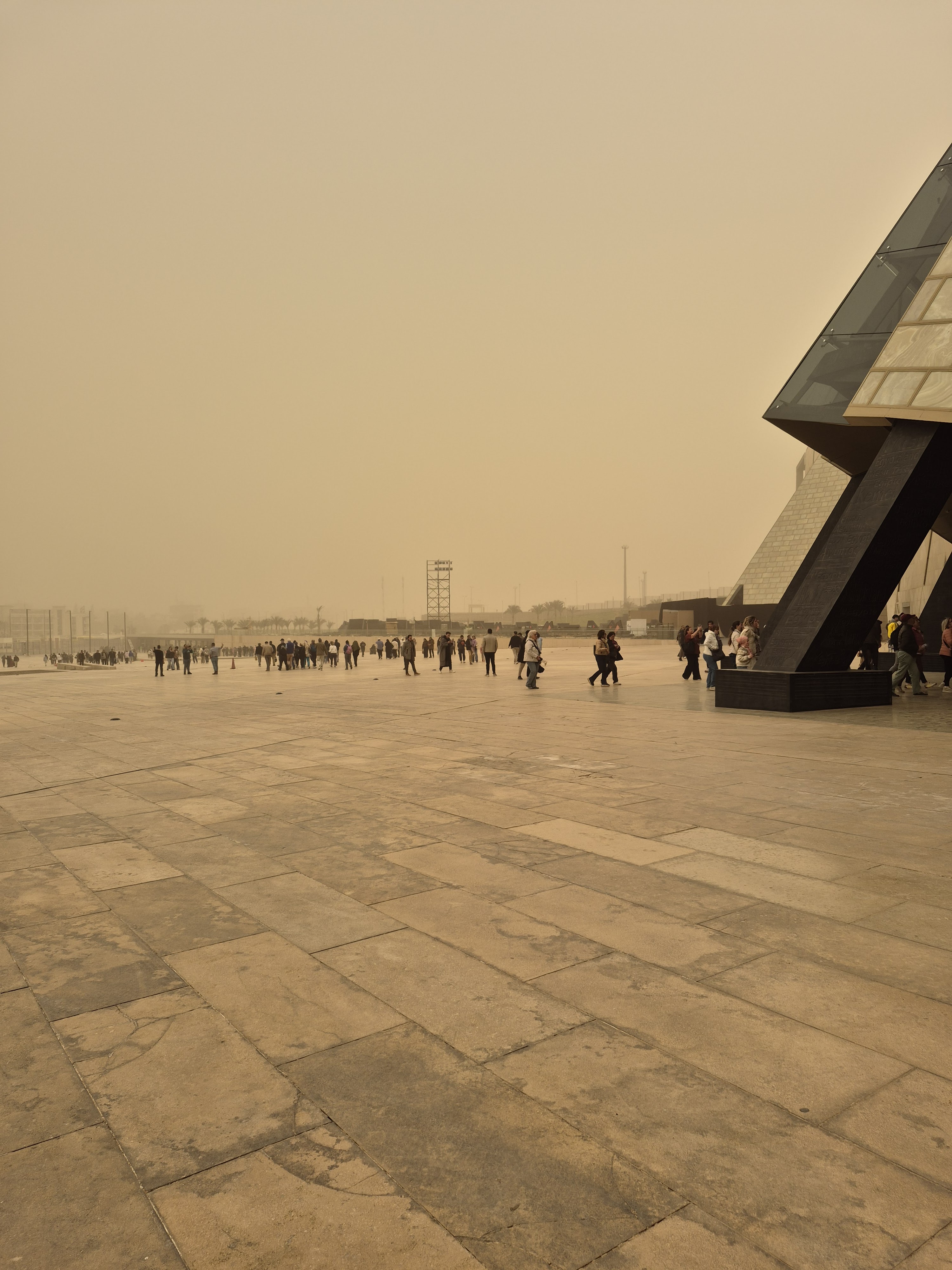 Two weeks ago, I was in Cairo, Egypt when a sandstorm hit. I did not know it was headed our way. We spent the morning in awe at the pyramids and sphinx. Learned the pyramid that appears the tallest is not in fact it just sits on a higher plateau. Once we finished traversing the pyramids at Giza we ventured into the Grand Egyptian museum. Walking in was amazing. From the outside you are faced with a massive gray stone building with the entrance being open with a gold pyramid facade. There is no door. Walking past the outer wall you are greeted by Ramses II, to the right is the cafe and gift shop, straight ahead, yet quite a distance, is the walkway to the ship building, and to the left is the massive museum. I promise I will post about the museum in the future. All the bottom entrance area is open to the elements. There is a fluidity to the architecture blending modern, environment, and antiquity.