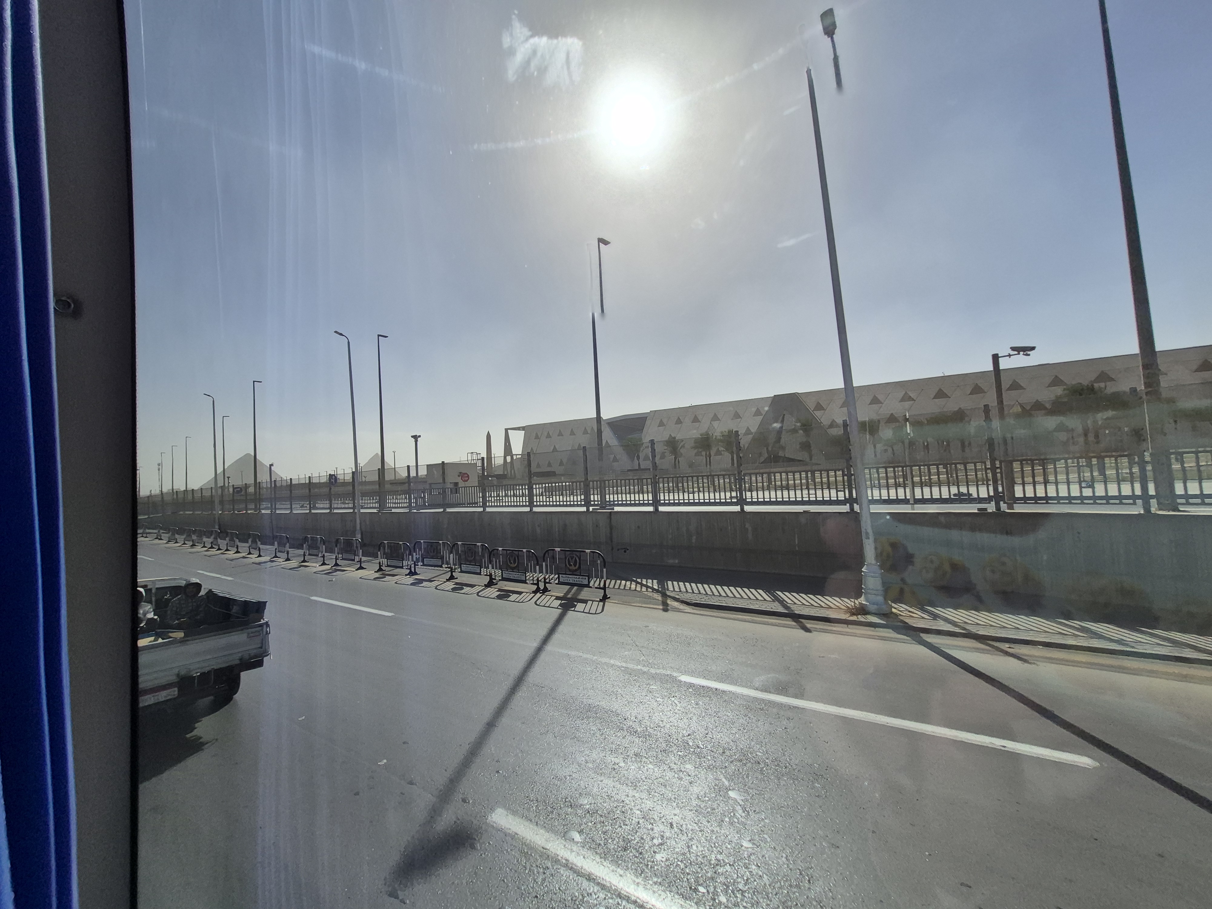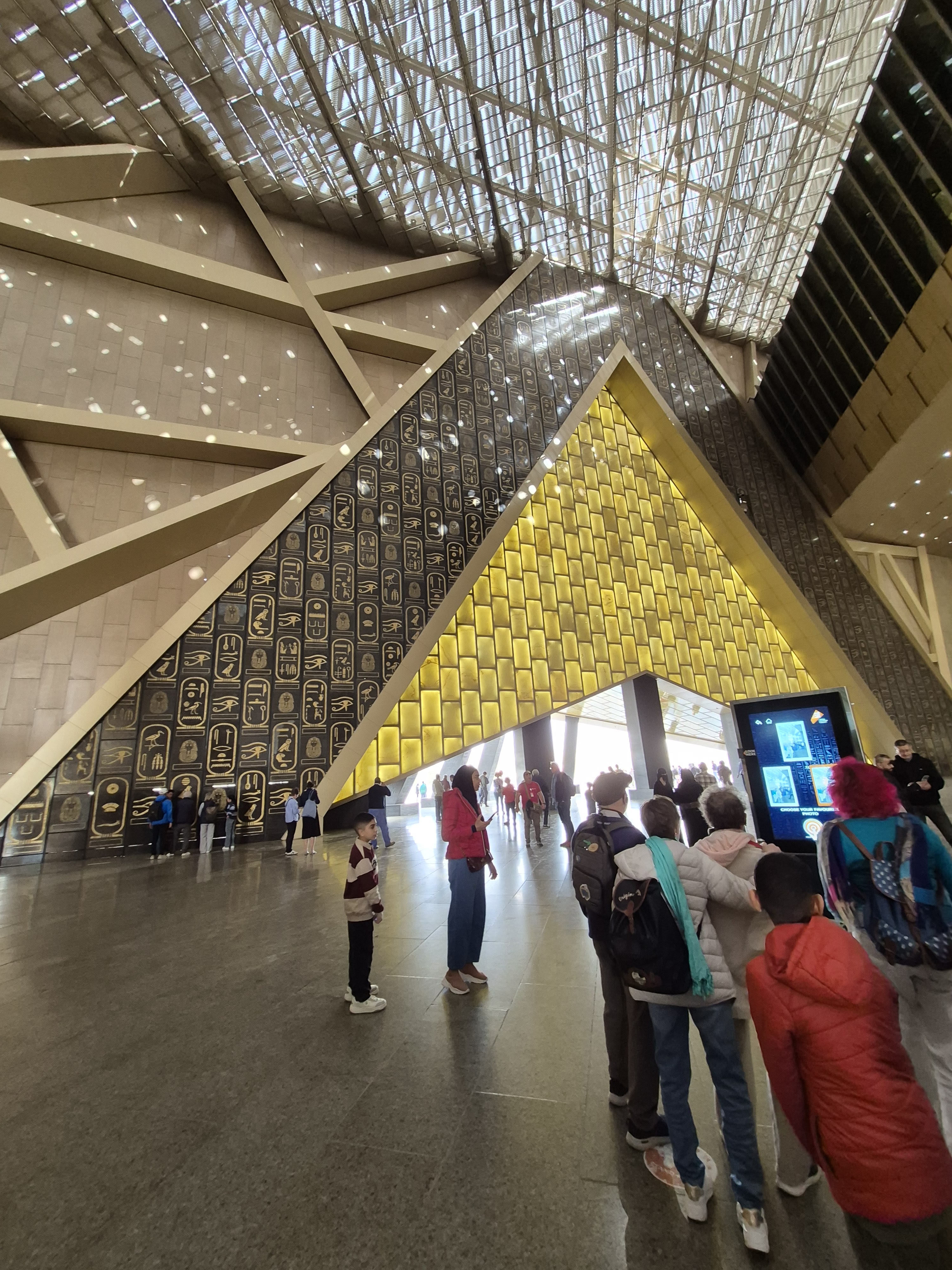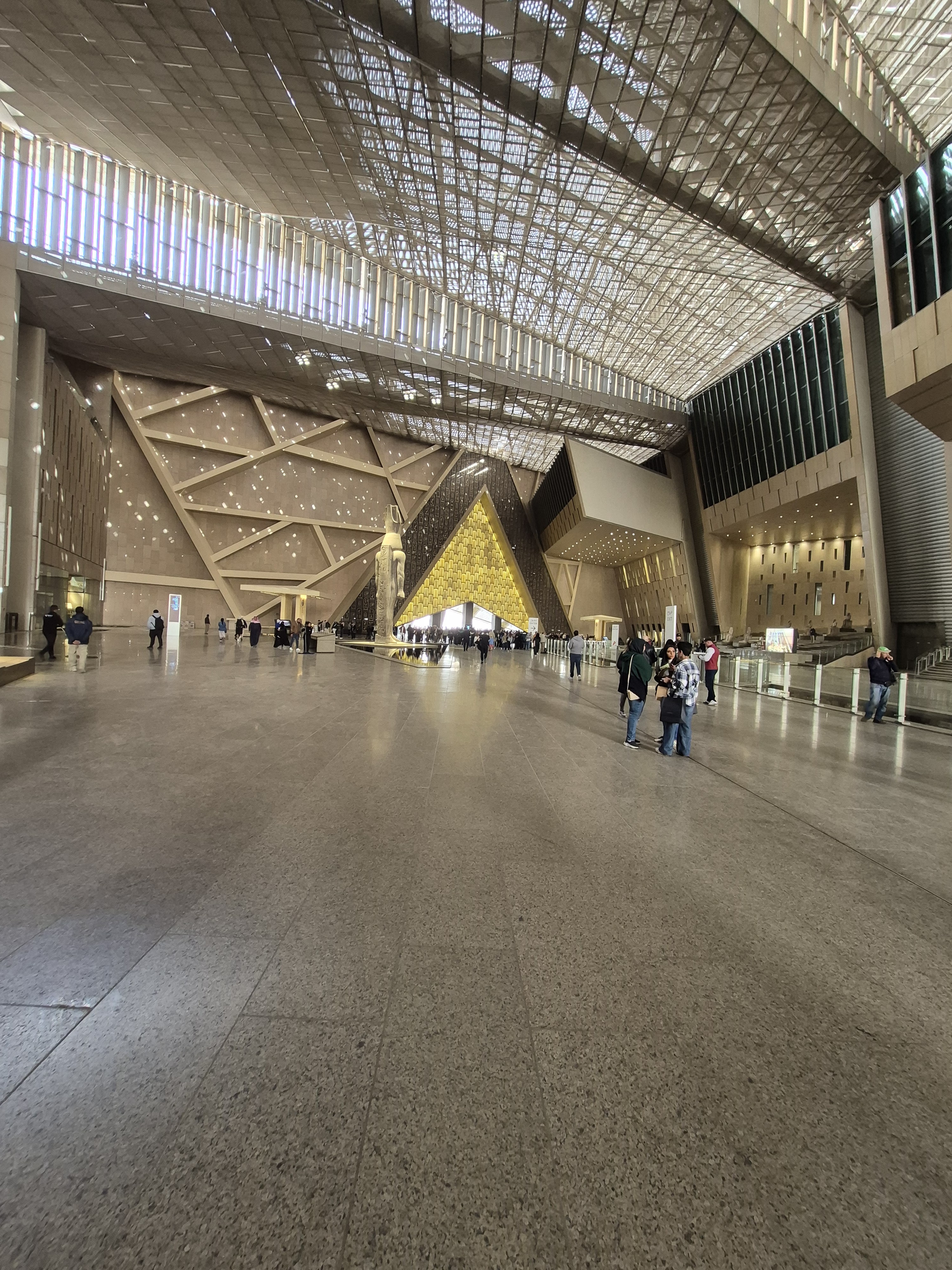 Two weeks ago, I was in Cairo, Egypt when a sandstorm hit. I did not know it was headed our way. We spent the morning in awe at the pyramids and sphinx. Learned the pyramid that appears the tallest is not in fact it just sits on a higher plateau. Once we finished traversing the pyramids at Giza we ventured into the Grand Egyptian museum. Walking in was amazing. From the outside you are faced with a massive gray stone building with the entrance being open with a gold pyramid facade. There is no door. Walking past the outer wall you are greeted by Ramses II, to the right is the cafe and gift shop, straight ahead, yet quite a distance, is the walkway to the ship building, and to the left is the massive museum. I promise I will post about the museum in the future. All the bottom entrance area is open to the elements. There is a fluidity to the architecture blending modern, environment, and antiquity.